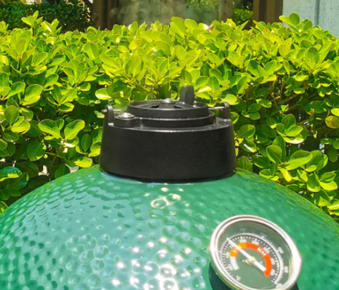 Closing the top vent reduces airflow and lowers temperature inside the grill. Start with it halfway closed and adjust as needed.