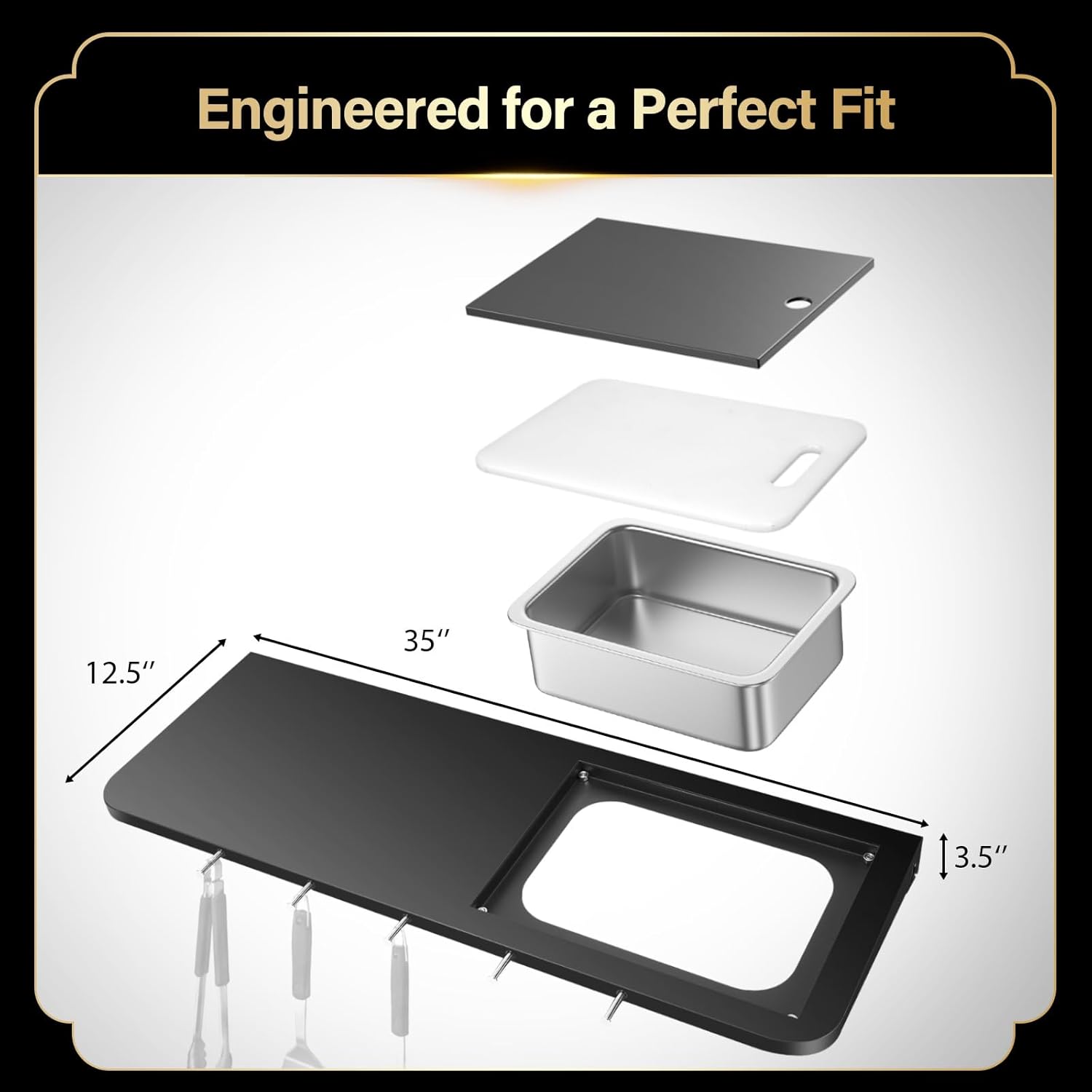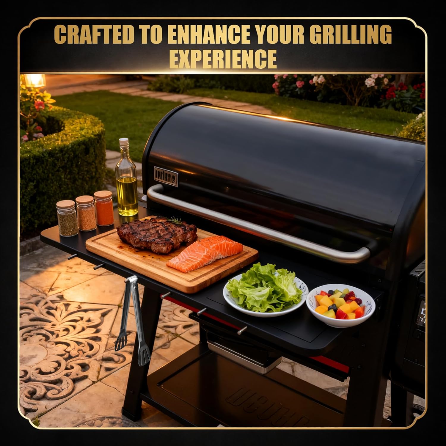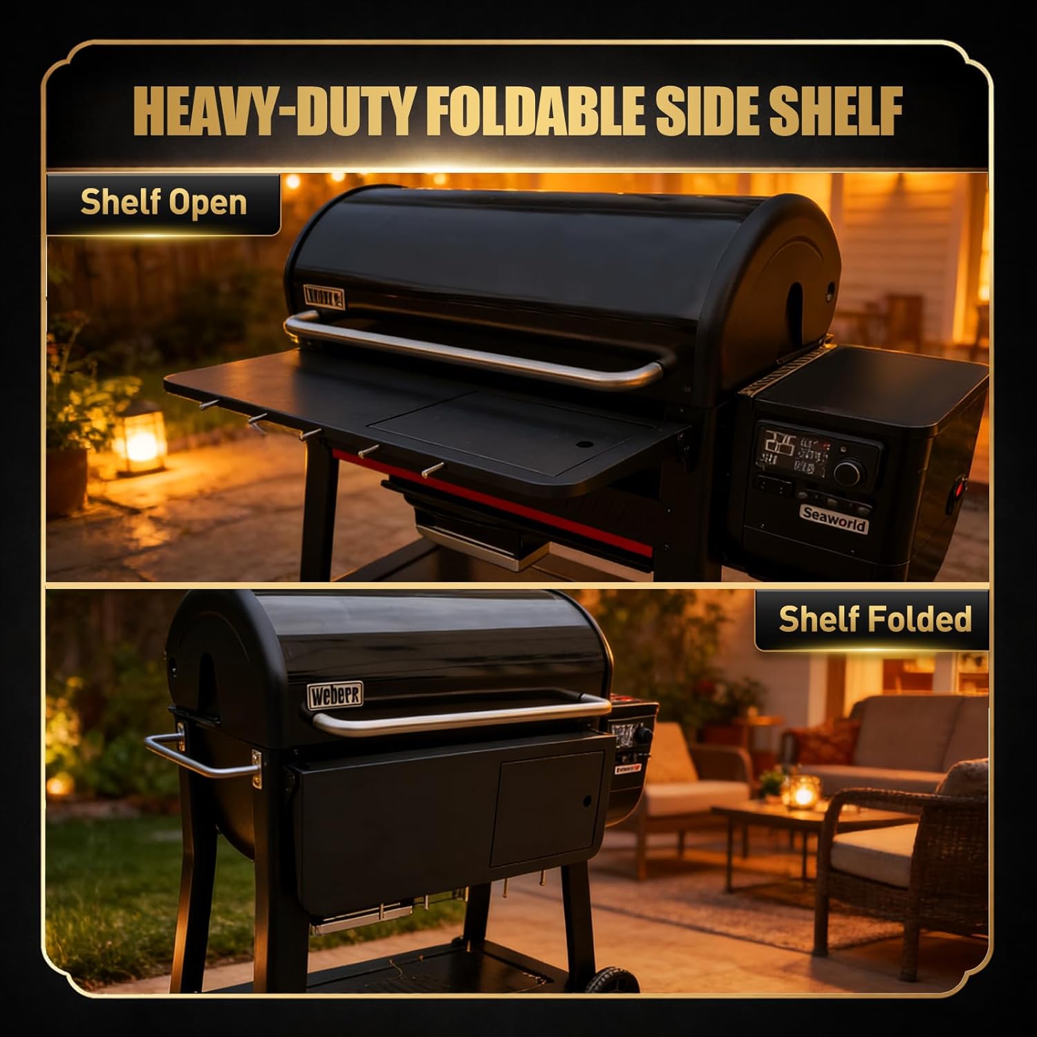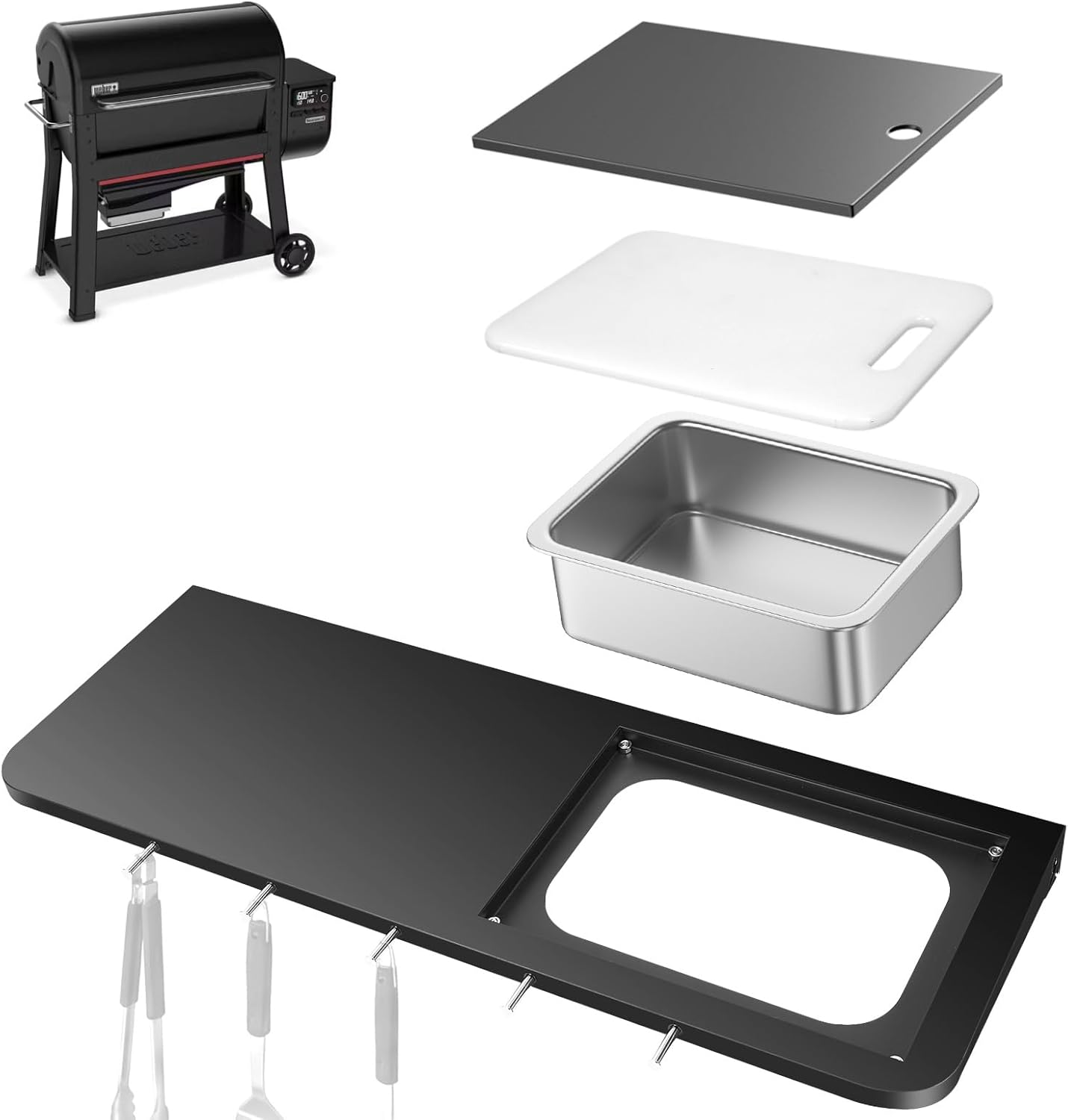 Front Table Shelf for Weber Searwood XL 600 Pellet Smoker, 35" x 12.5" Large Front Shelf with Stainless Steel Pan, Cutting Board, Lid & 5 Hooks