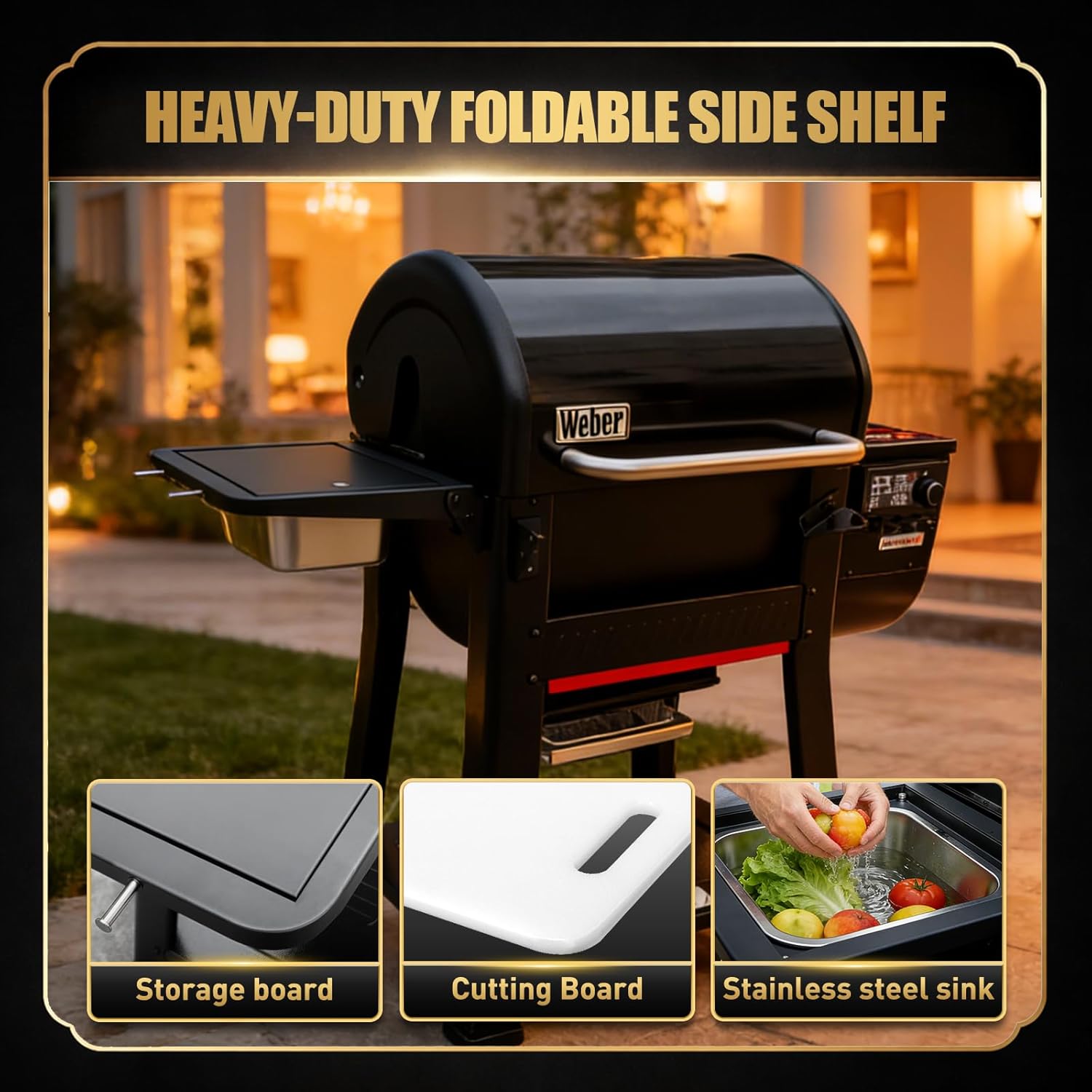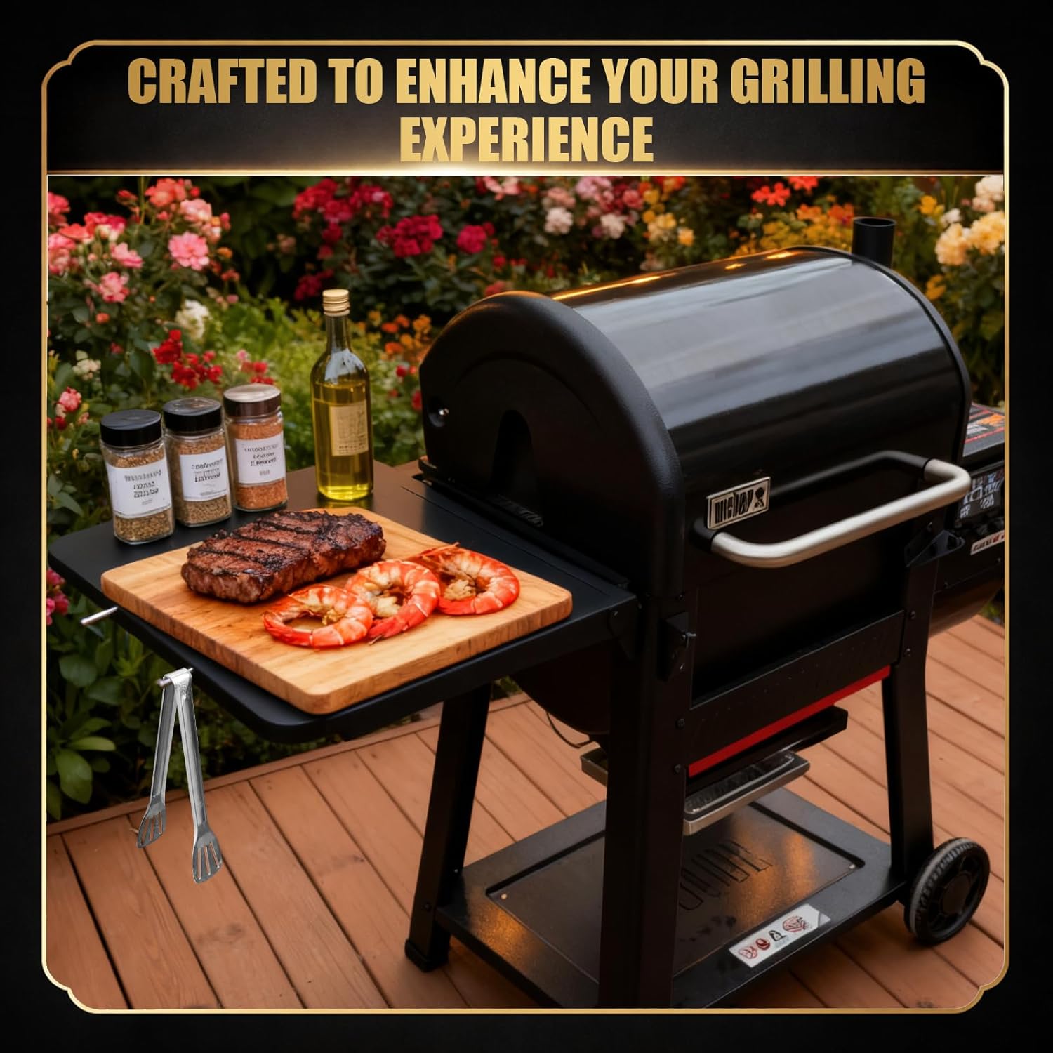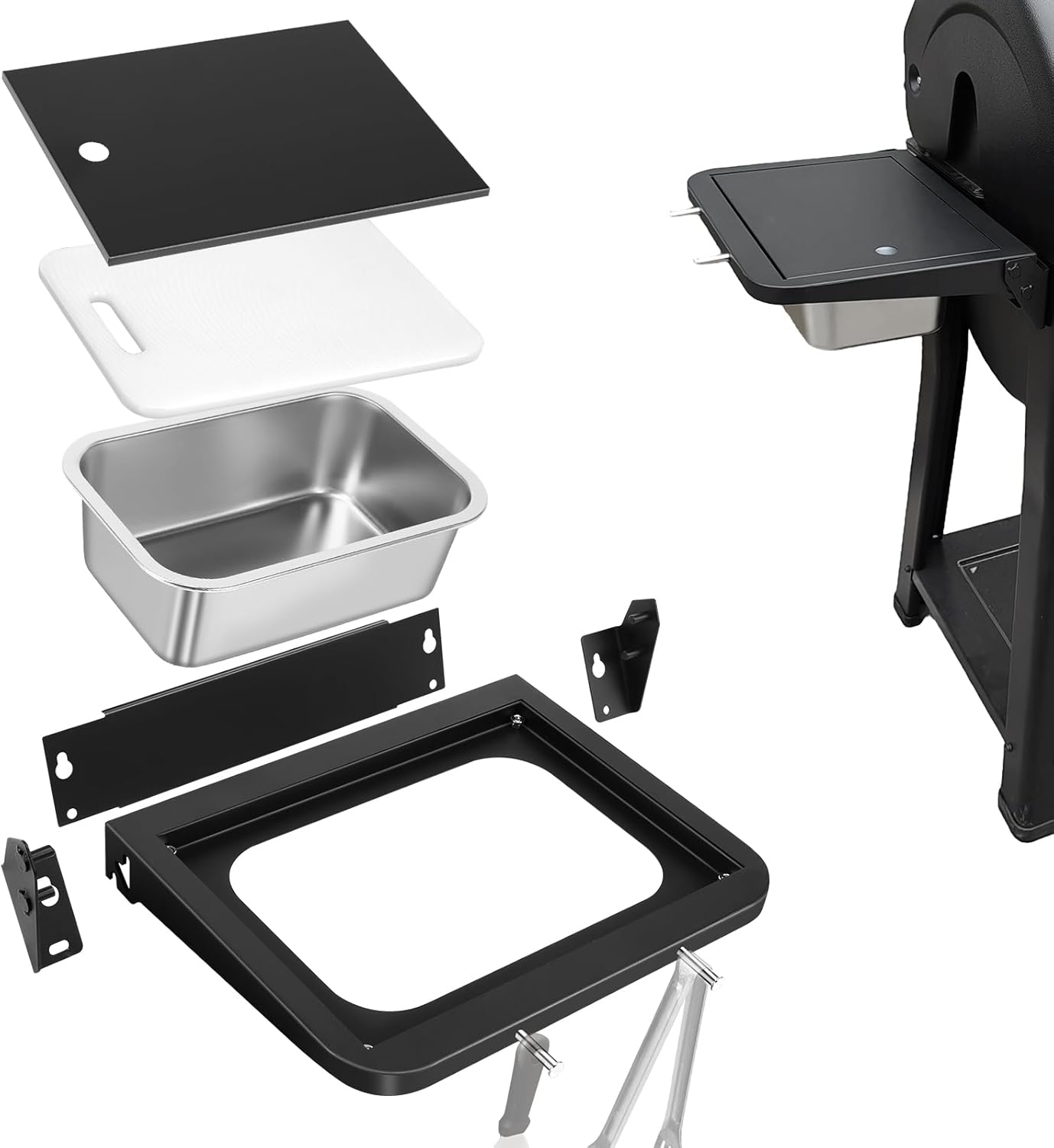 Side Table Shelf for Weber Searwood 600 / XL 600 Pellet Smoker, Foldable BBQ Prep Station with Stainless Steel Pan, Cutting Board, Lid & Hooks