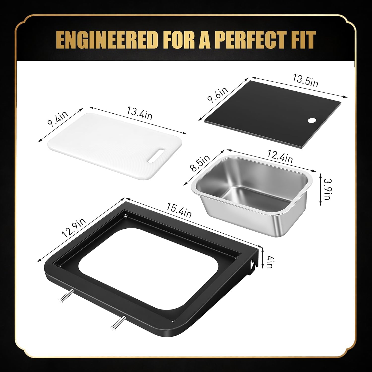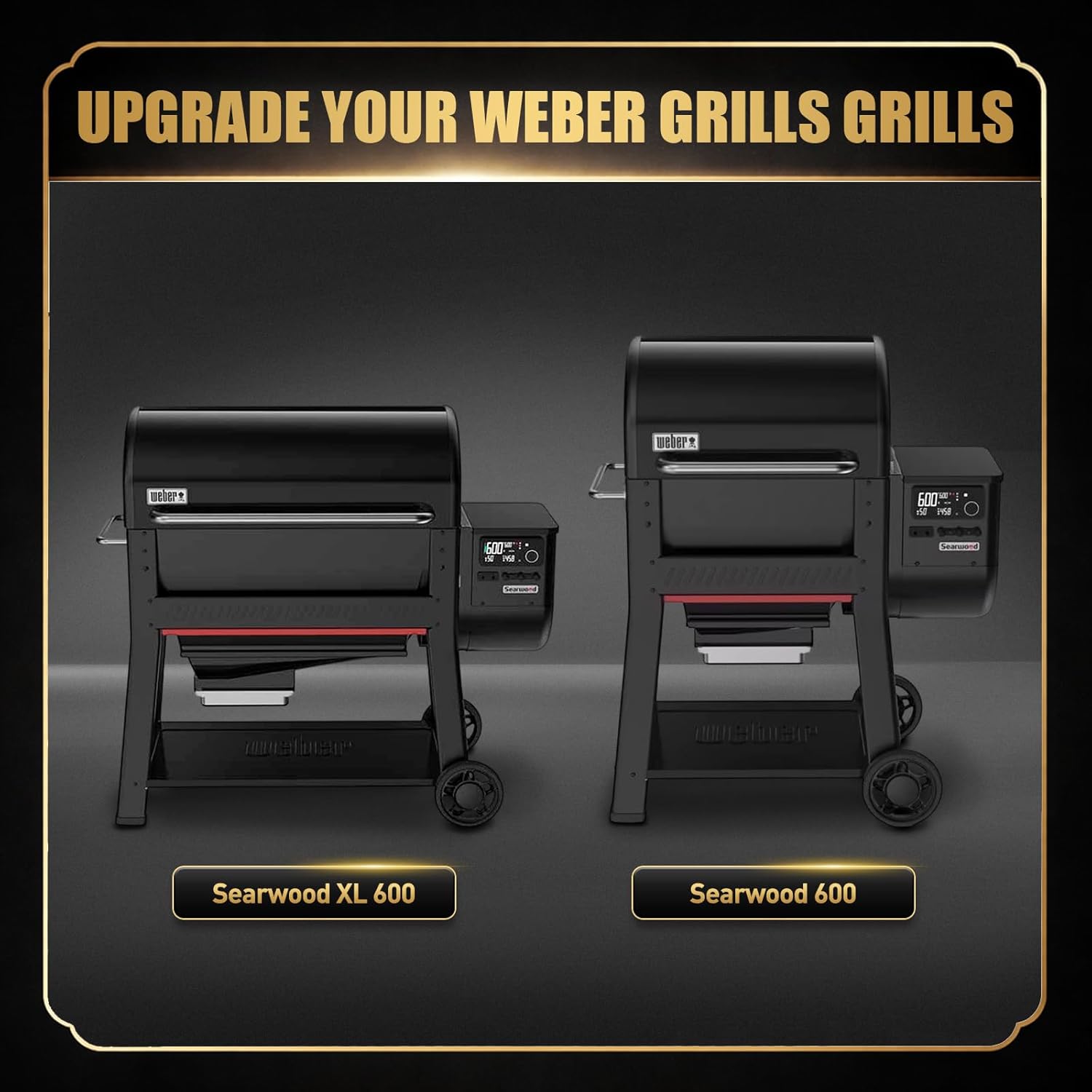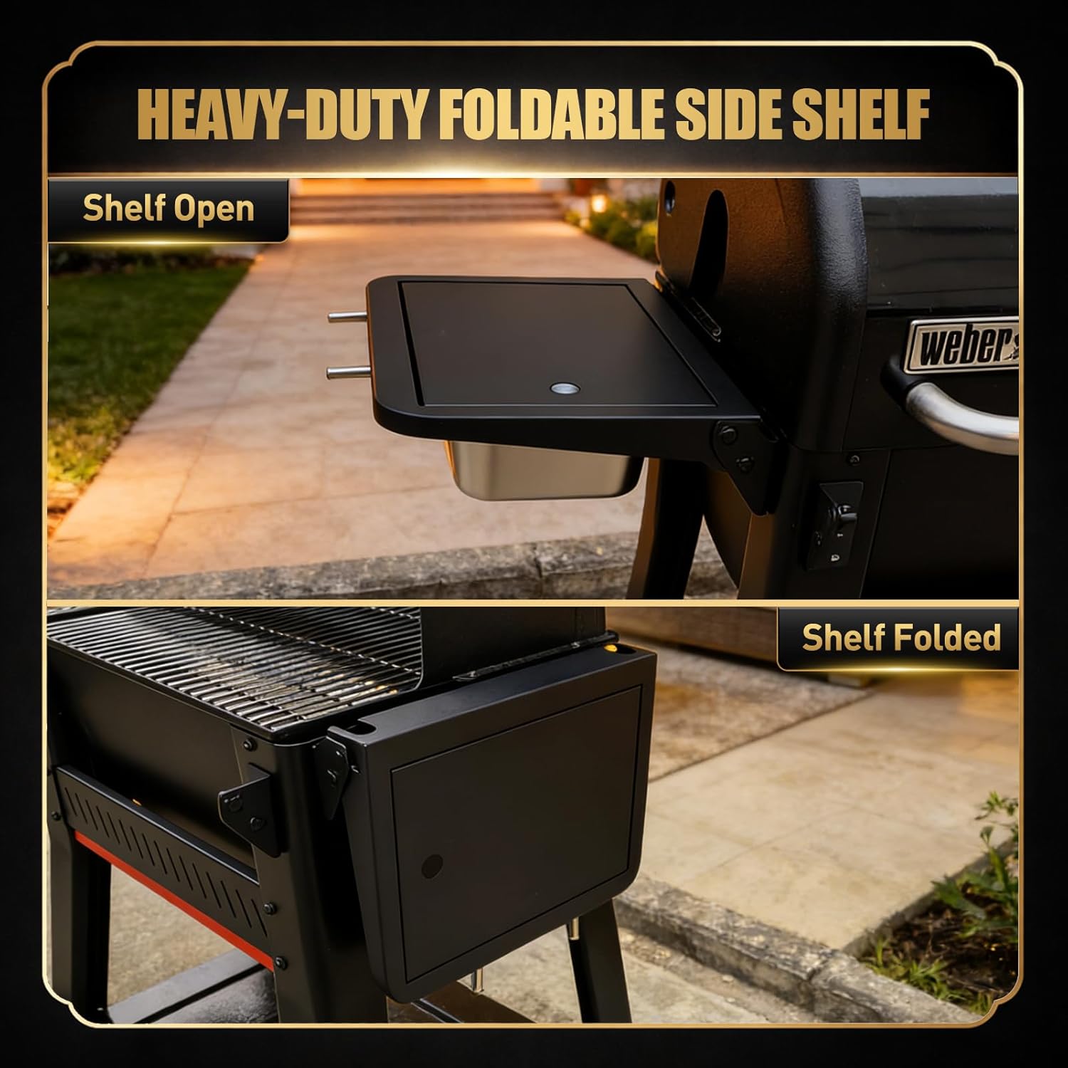 Side Table Shelf for Weber Searwood 600 / XL 600 Pellet Smoker, Foldable BBQ Prep Station with Stainless Steel Pan, Cutting Board, Lid & Hooks