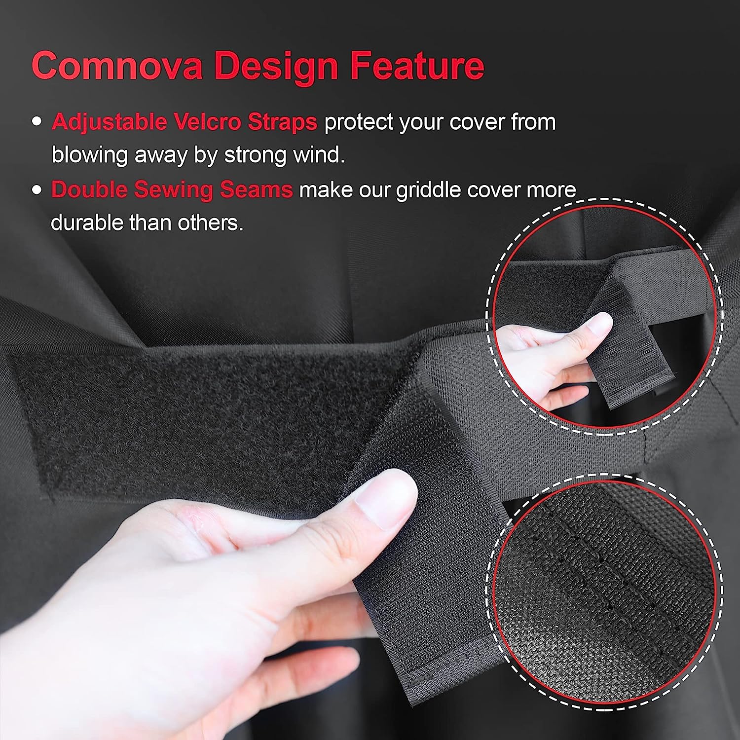 | Heavy Duty and Waterproof Cover | - Comnova bbq gas grill covers are made of 600D heavy-duty oxford cloth with waterproof PU coating And UV-resistant coating. Compared with PVC, our bbq covers are softer and more breathable. Our barbecue grill covers can protect your bbq grill from heavy rain, snow, straight sunshine, tear and fading. More importantly, PU coating is more environmentally friendly!