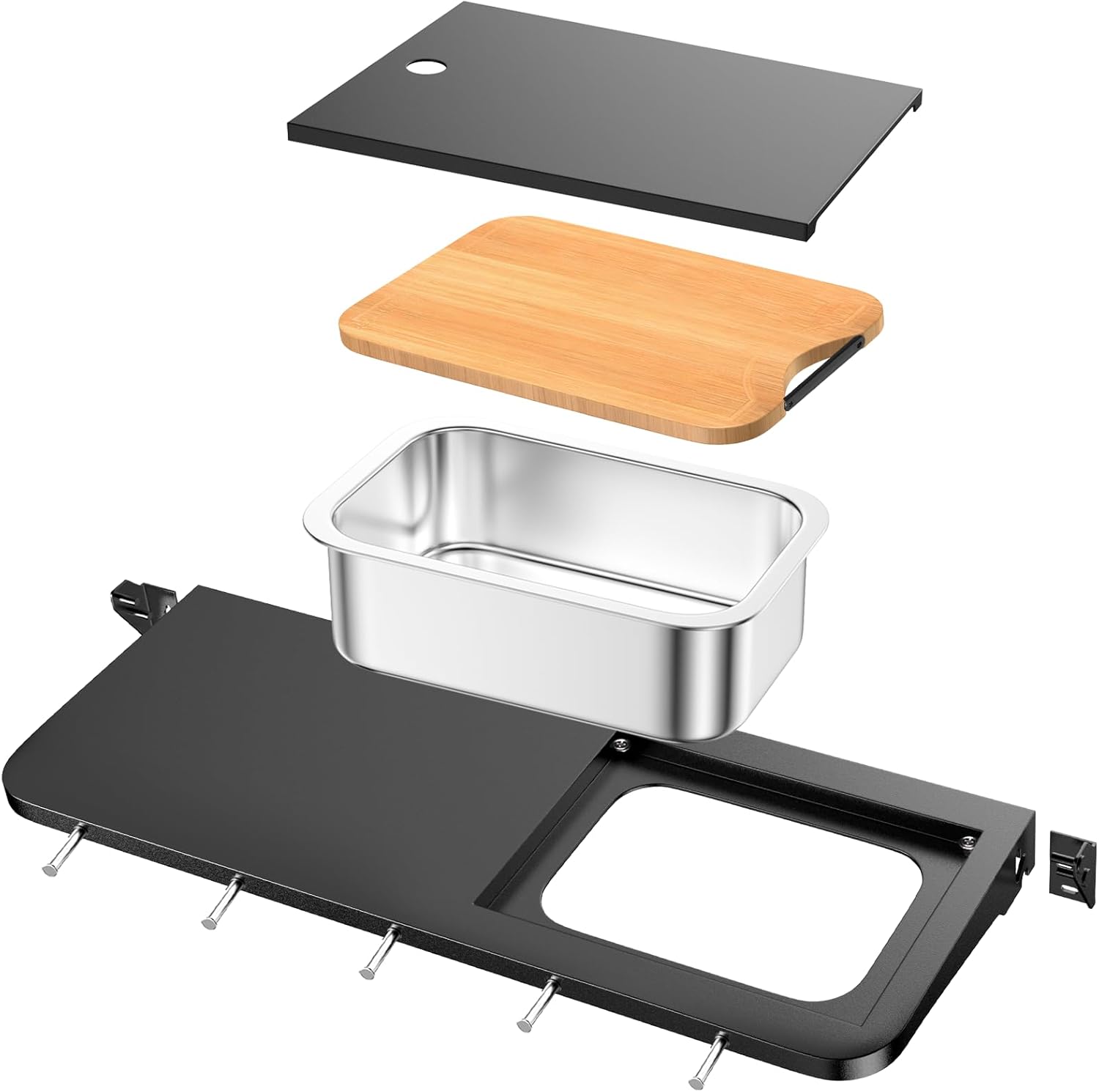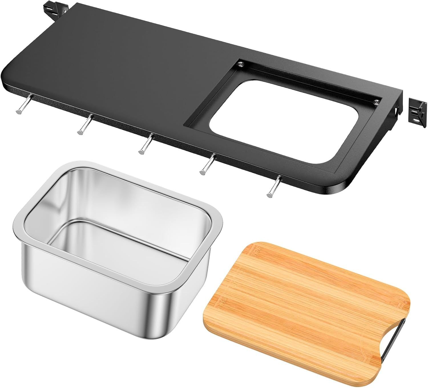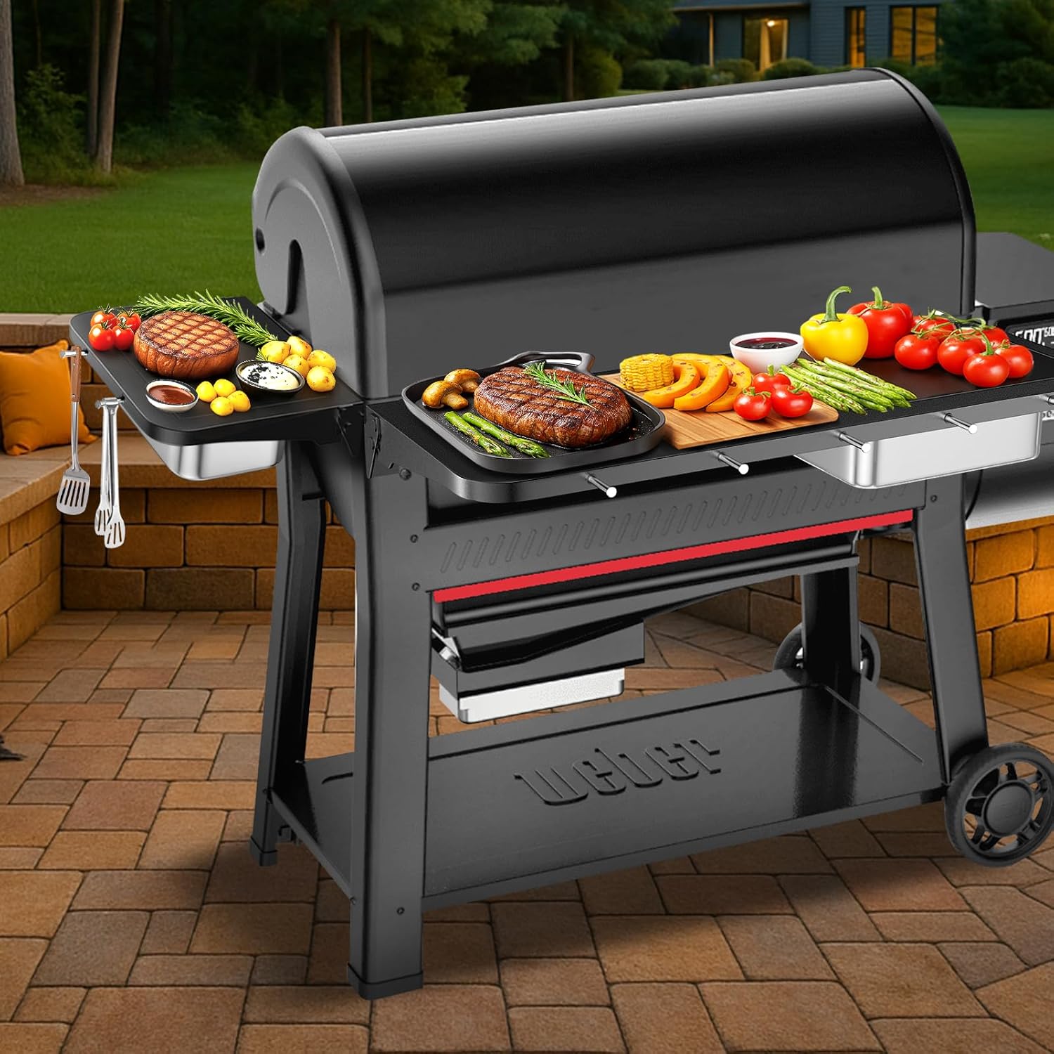 Front Table Shelf for Weber Searwood XL 600 Pellet Smoker, 35" x 12.5" Large Front Shelf with Stainless Steel Pan, Wood Cutting Board, Lid & 5 Hooks
