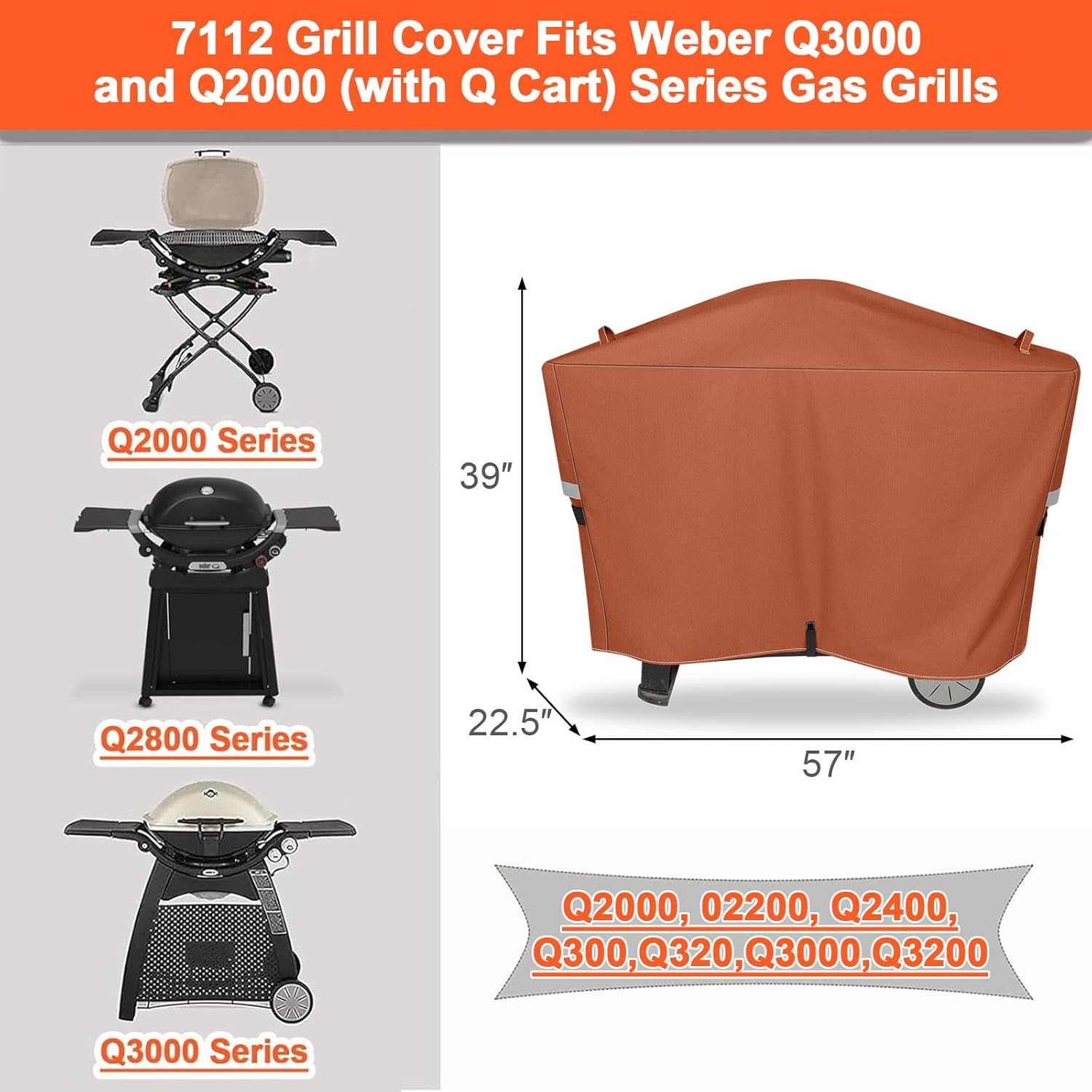 Grill Cover 7112 for Weber Q2000, Q2200, Q2400, Q2000N+, Q2800N+, Q300, Q320, Q3000, Q3200 Gas Grills, 600D Waterproof Fade Resistant Cover, Brown
