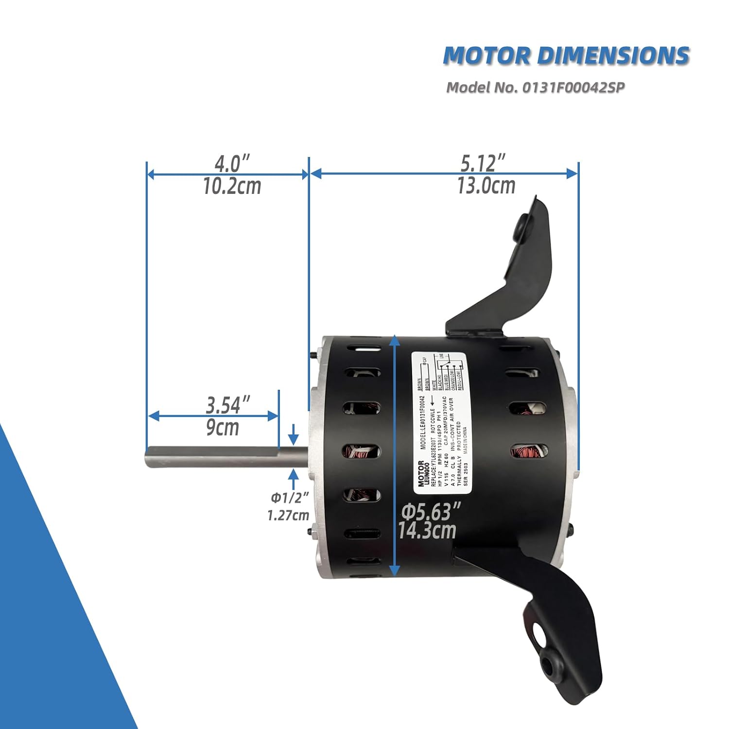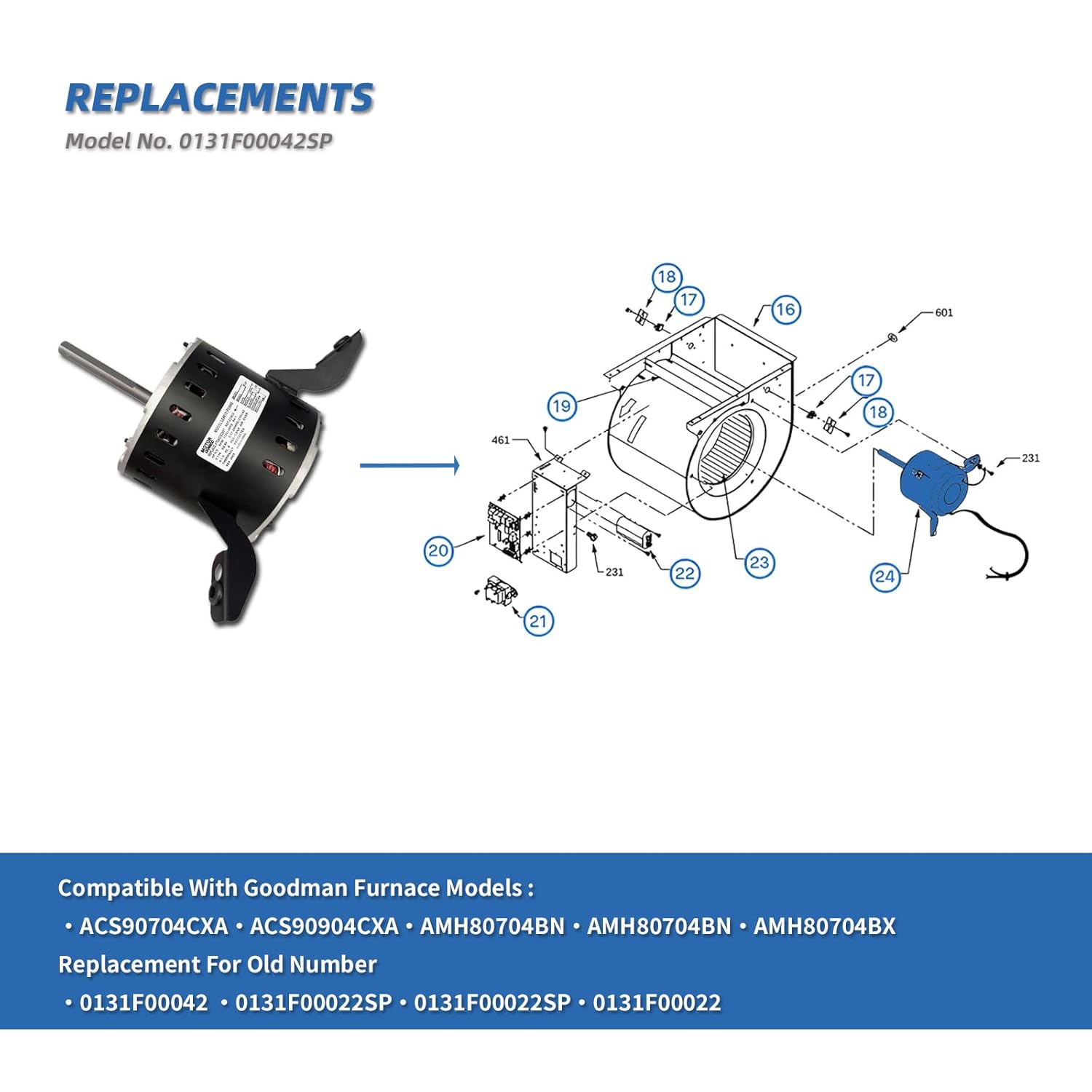 0131F00042SP Blower Fan Motor for Goodman Amana Janitrol Furnace, 1/2HP 115V 1130RPM/4Speeds 7.0A 375W B13400-24S 0131F00022SP Y7L623E203T LEUNGOO