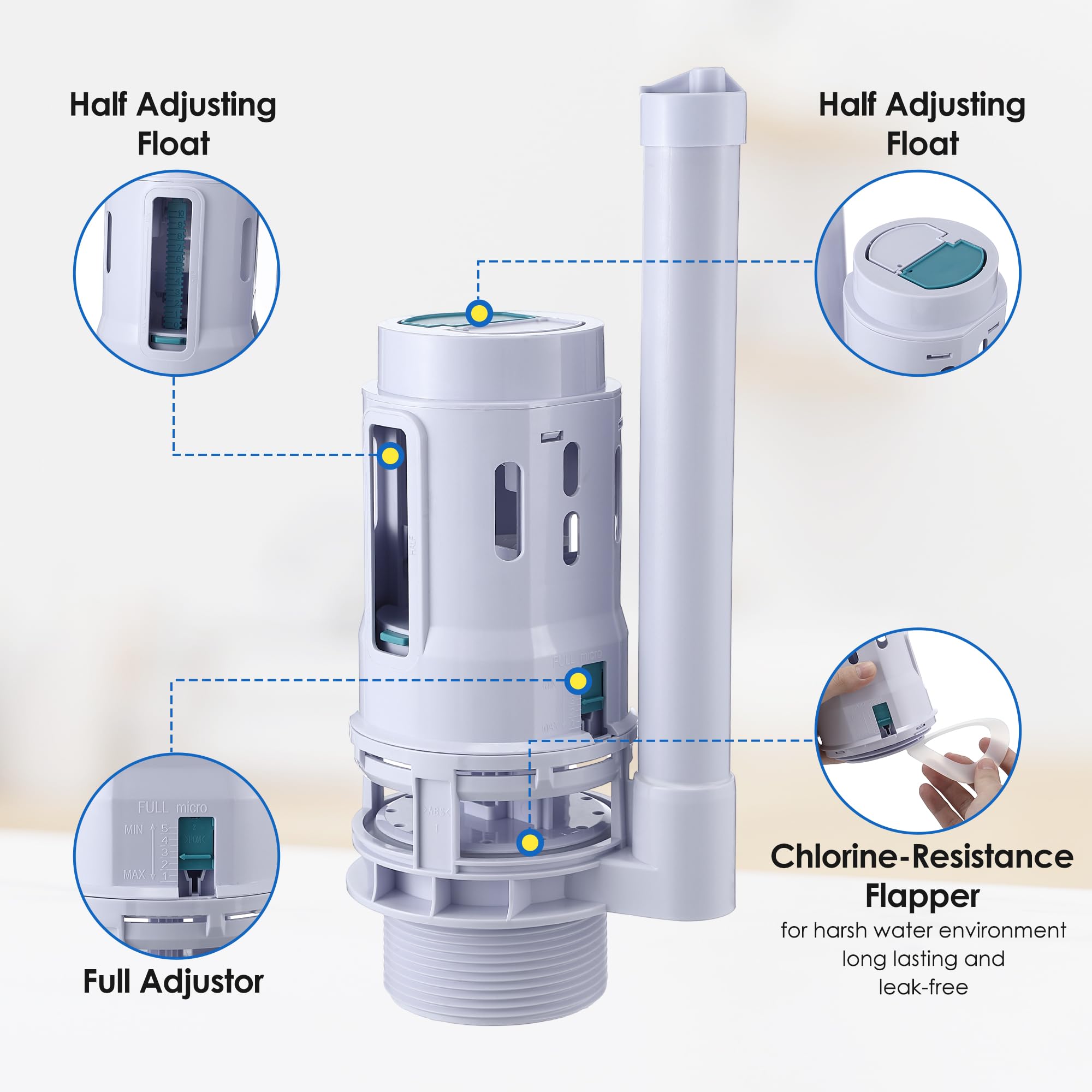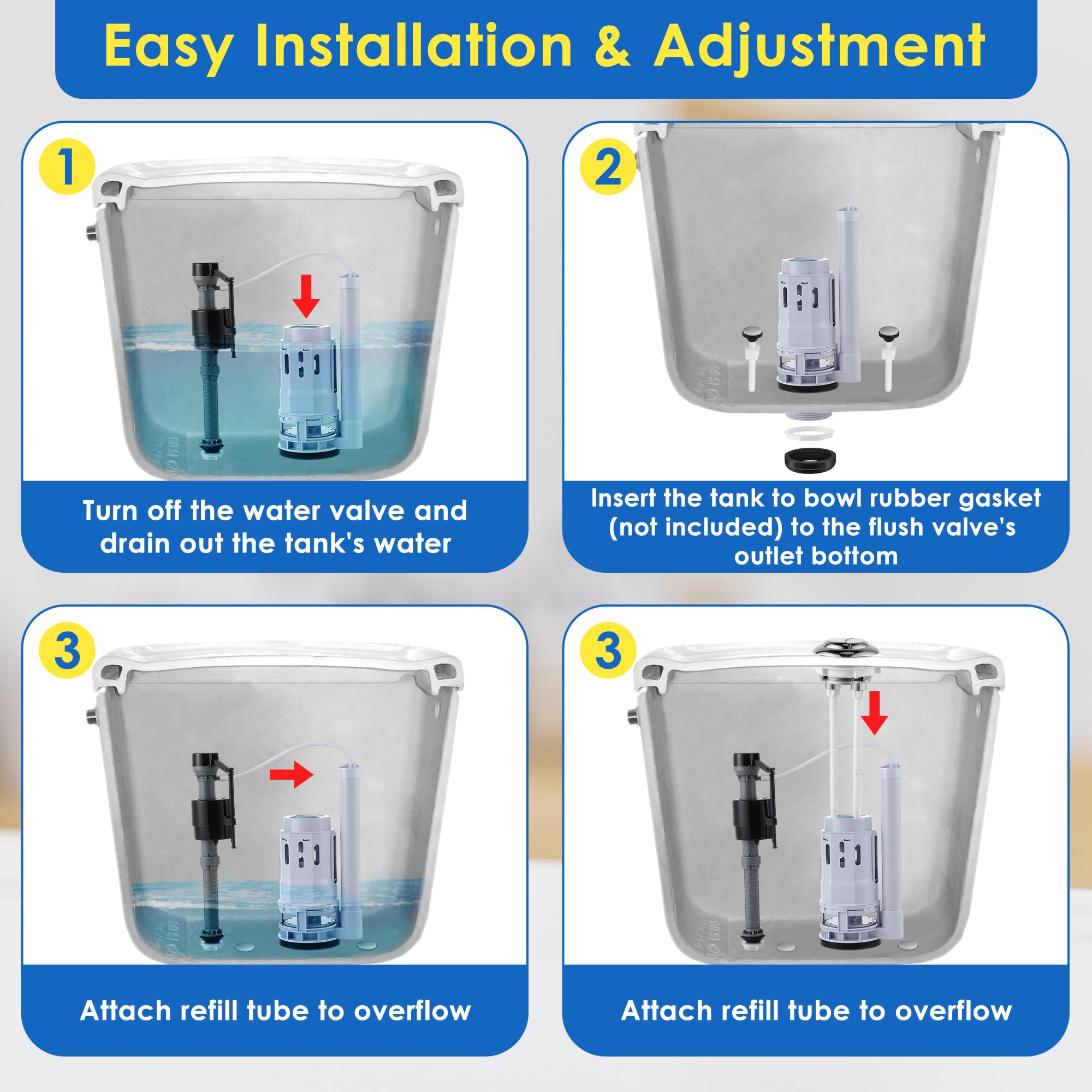 1 Pack 3 Inch Universal Toilet Tank Replacement Kit, Dual Flush Valve with Push Button, Toilet Fill Valve, Bowl Gasket and Plastic Bolts