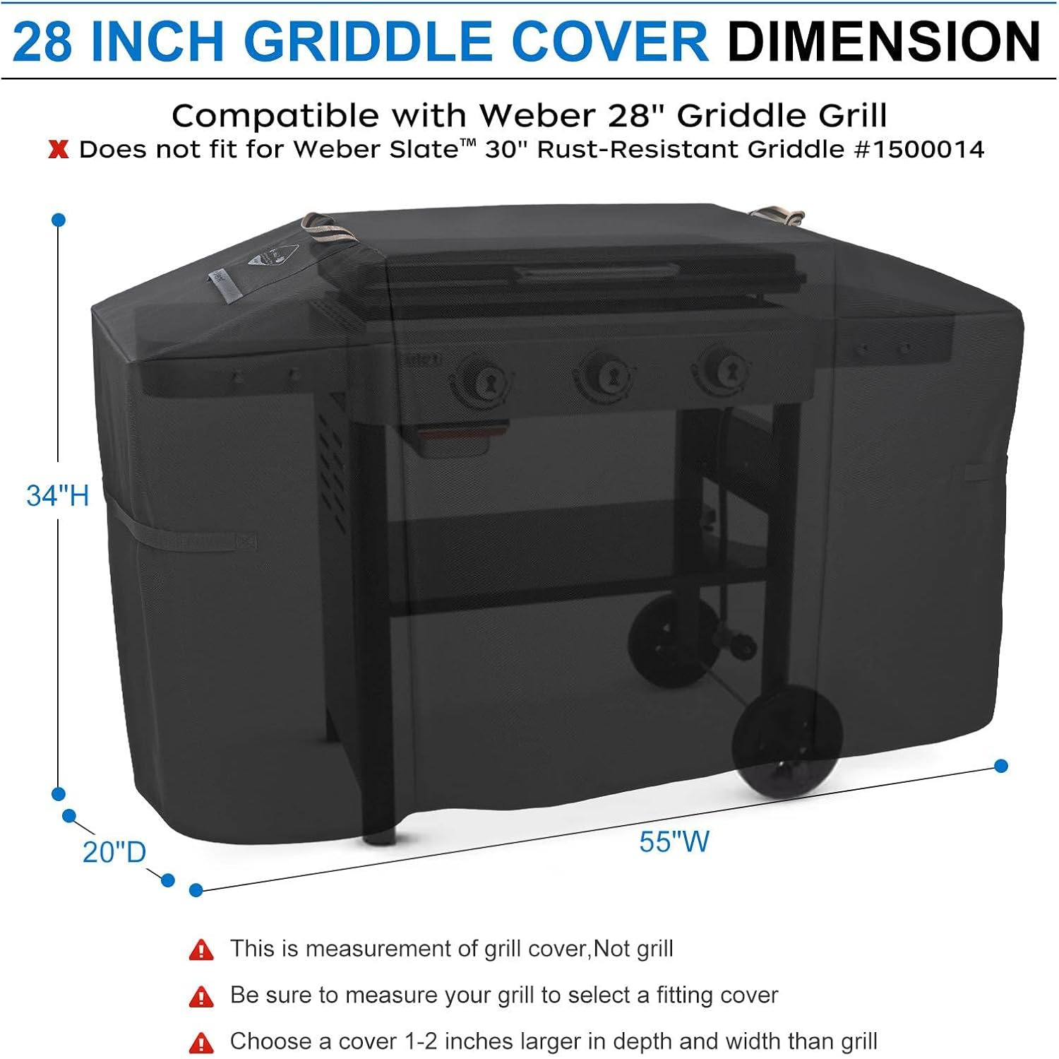 【28 Inch Griddle Cover for Weber】The flat top grill cover measures 55"W x 20"D x 34"H, compatible with Weber 28" Griddle, Weber 43310201, Weber G28 Griddle, Weber 28 inch Griddle; compared to Weber 7771 griddle cover, also fit most 3 burner griddle with similar size. ※Does not fit for Weber Slate 30" Rust-Resistant Griddle. ※Be sure to measure your grill first to determine the proper cover size.