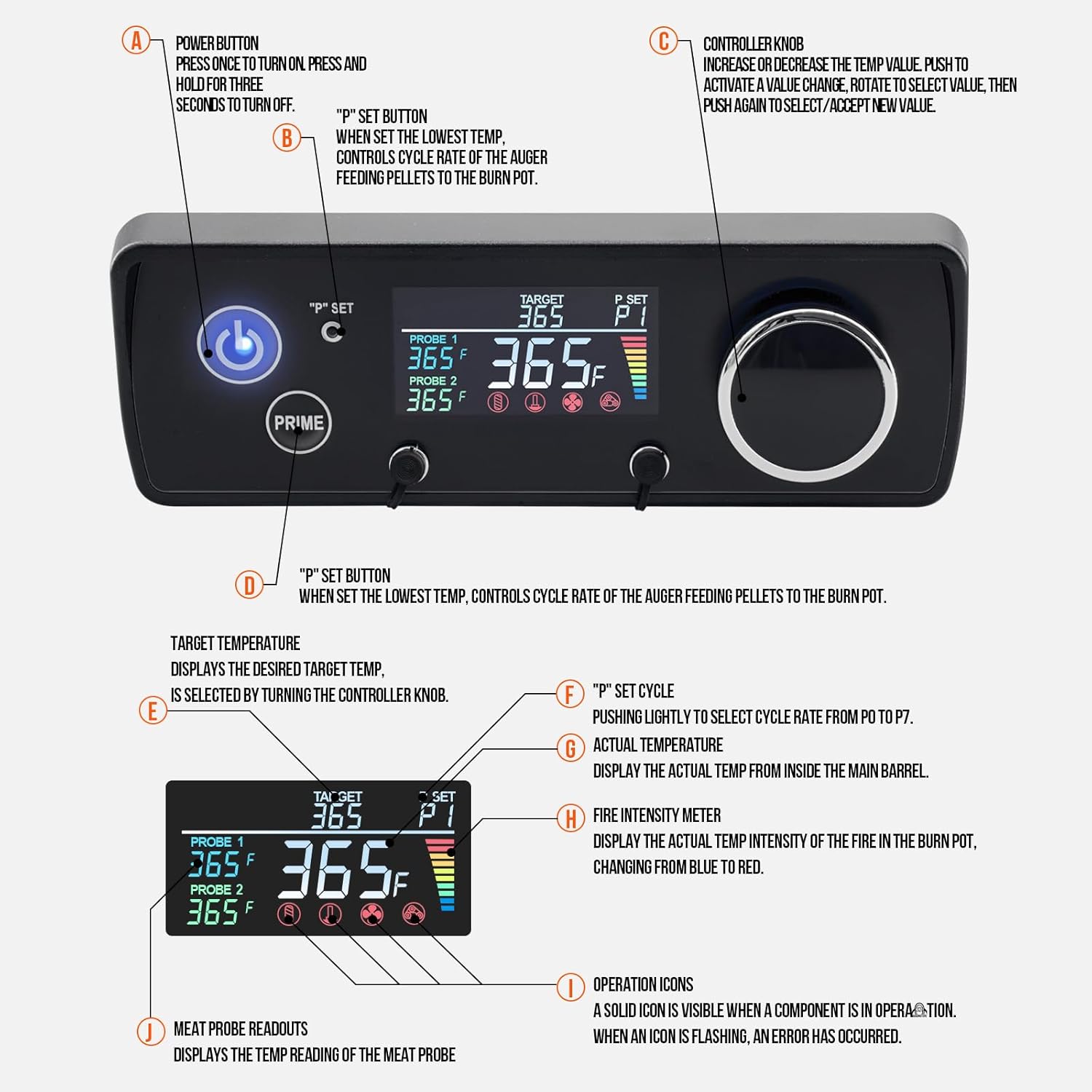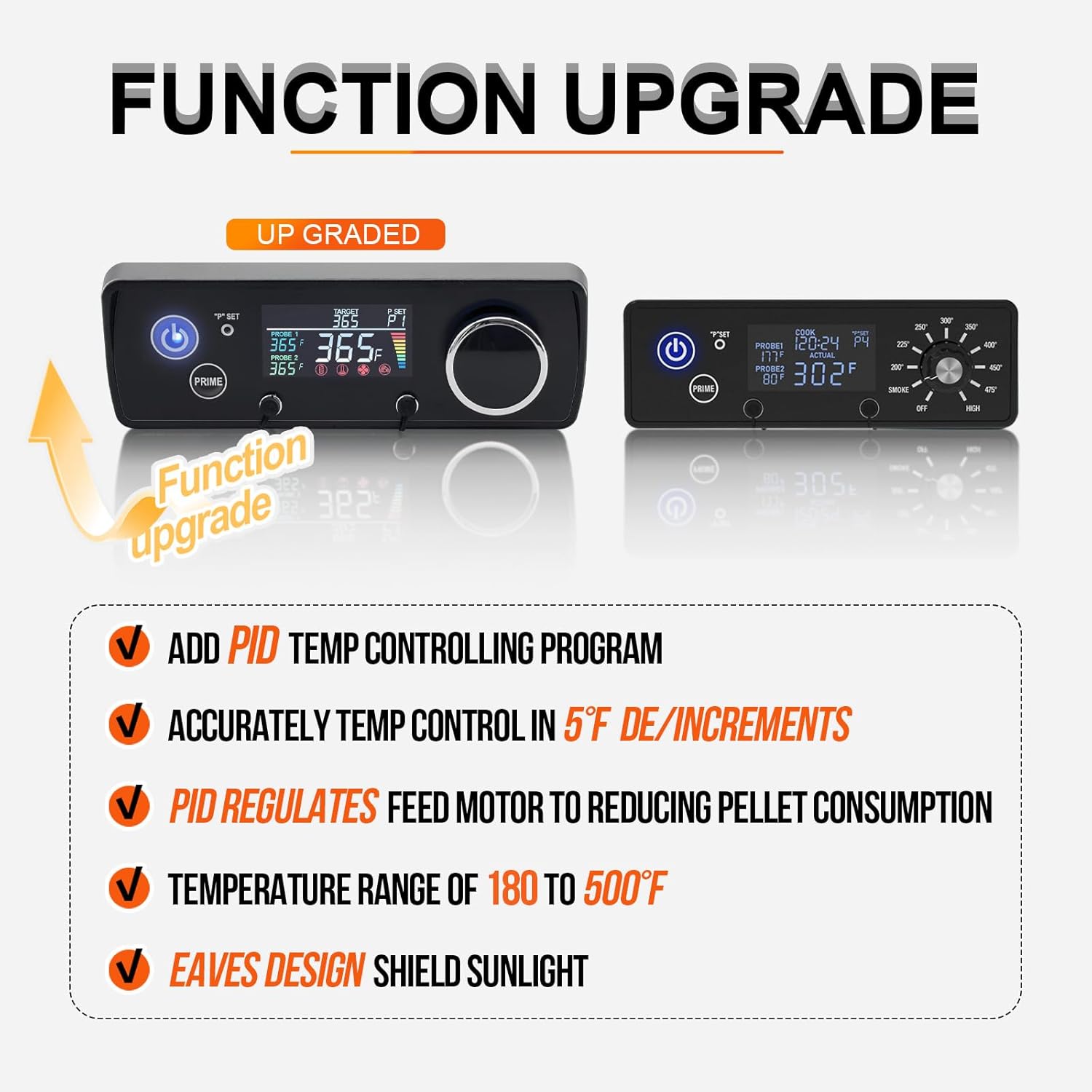 【PID Precision Temp Control ±5°F】Smart PID algorithm dynamically adjusts pellet feed (auger) and airflow (fan) for rock-solid temperature stability. The control board also features 5-degree increment settings to target indirect cooking temperatures ranging from 180 to 500°F