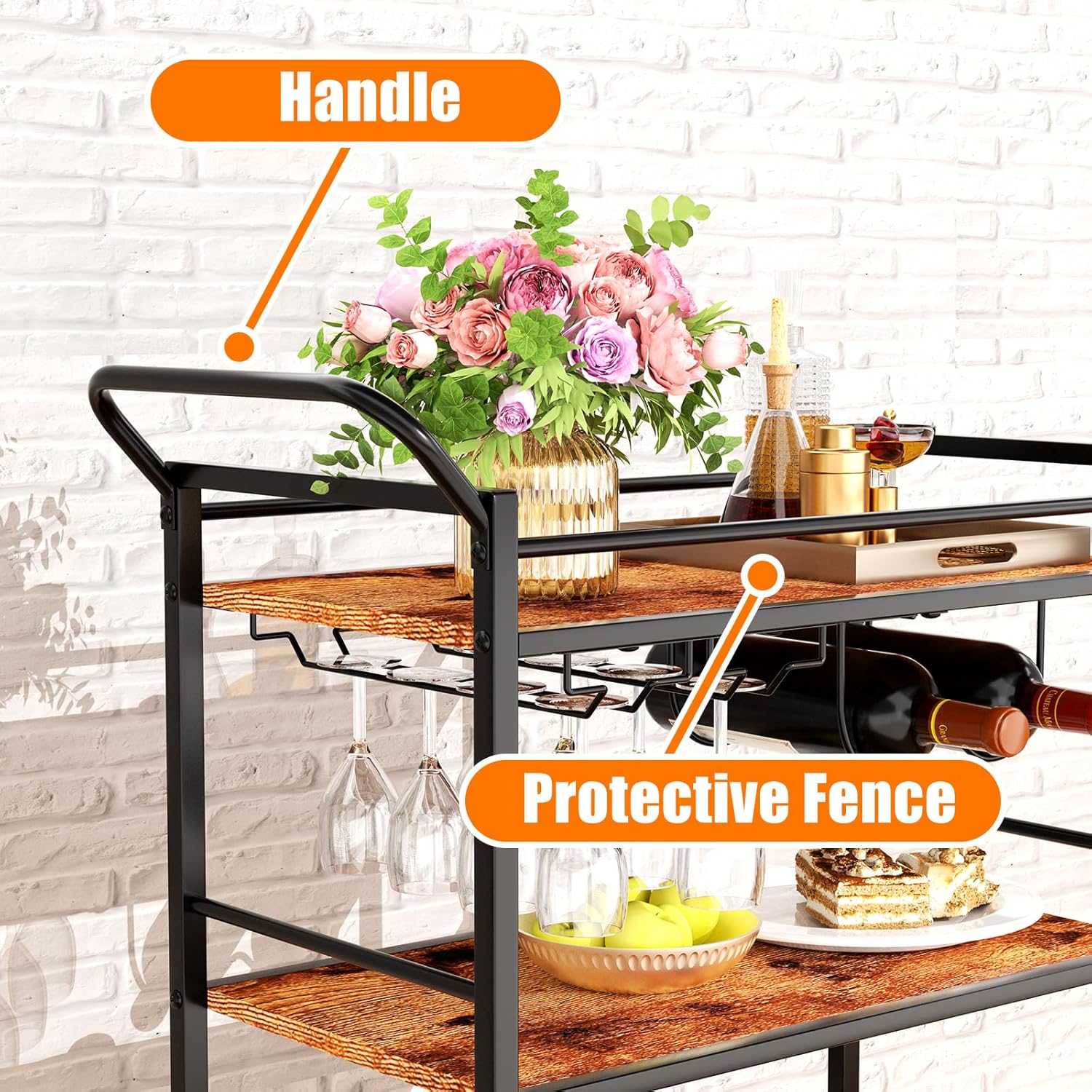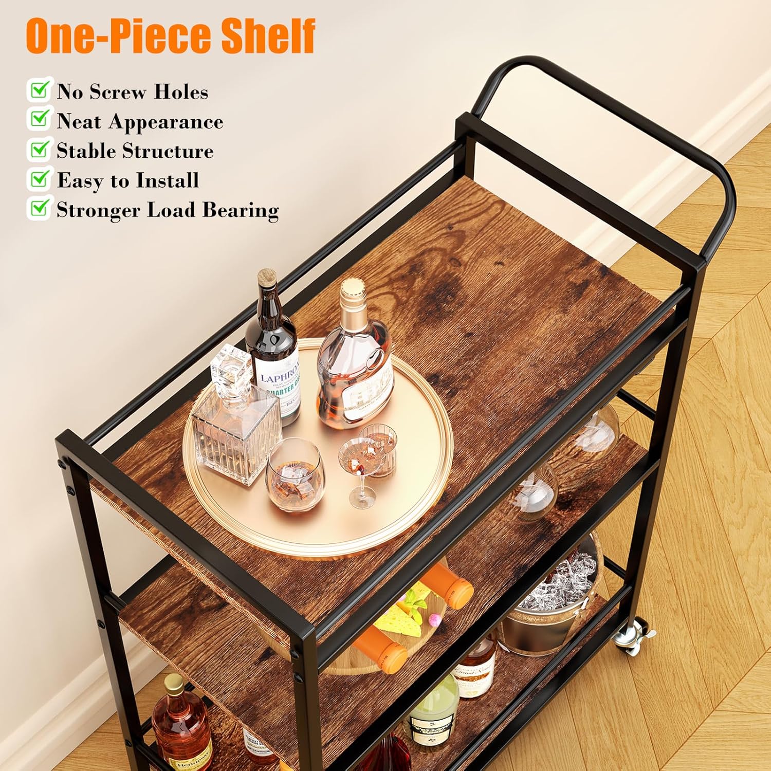 Bar Cart, Home Bar Serving Cart, Rolling Bar Carts, Bar Station, Drink Cart with Wine Rack, Glass Holder, One-Piece Wood Shelf, for Kitchen, Brown