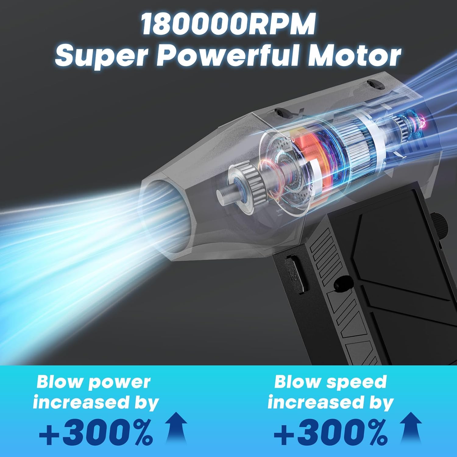 【180,000 RPM Super Powerful Turbine Motor】This compressed air duster has a maximum speed of 180,000 RPM, delivering up to 200G of air pressure and over 80 m/s of air velocity. The ultra high-speed turbine motor ensures superior performance and powerful airflow, allowing you to easily remove dirt hidden in every crevice of your keyboard or any electronic device with maximum efficiency, making it extremely convenient to use in your home, office, or car dust collector