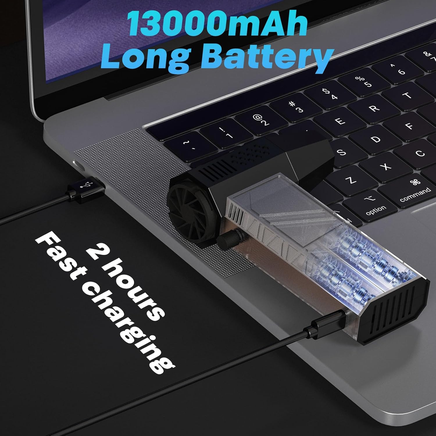 【13000mAh Long Battery Life & Fast Charging】This electric air duster is equipped with a 10,000mAh battery for extended use time and ensures long-lasting performance. With Type-C fast charging, it can be fully charged in 2-2.5 hours. At the lowest speed setting, it can run for up to 60 minutes, providing reliable power for your cleaning tasks. In addition, our large-capacity battery (which can be shipped by airplane) has temperature protection, current protection and short circuit protection