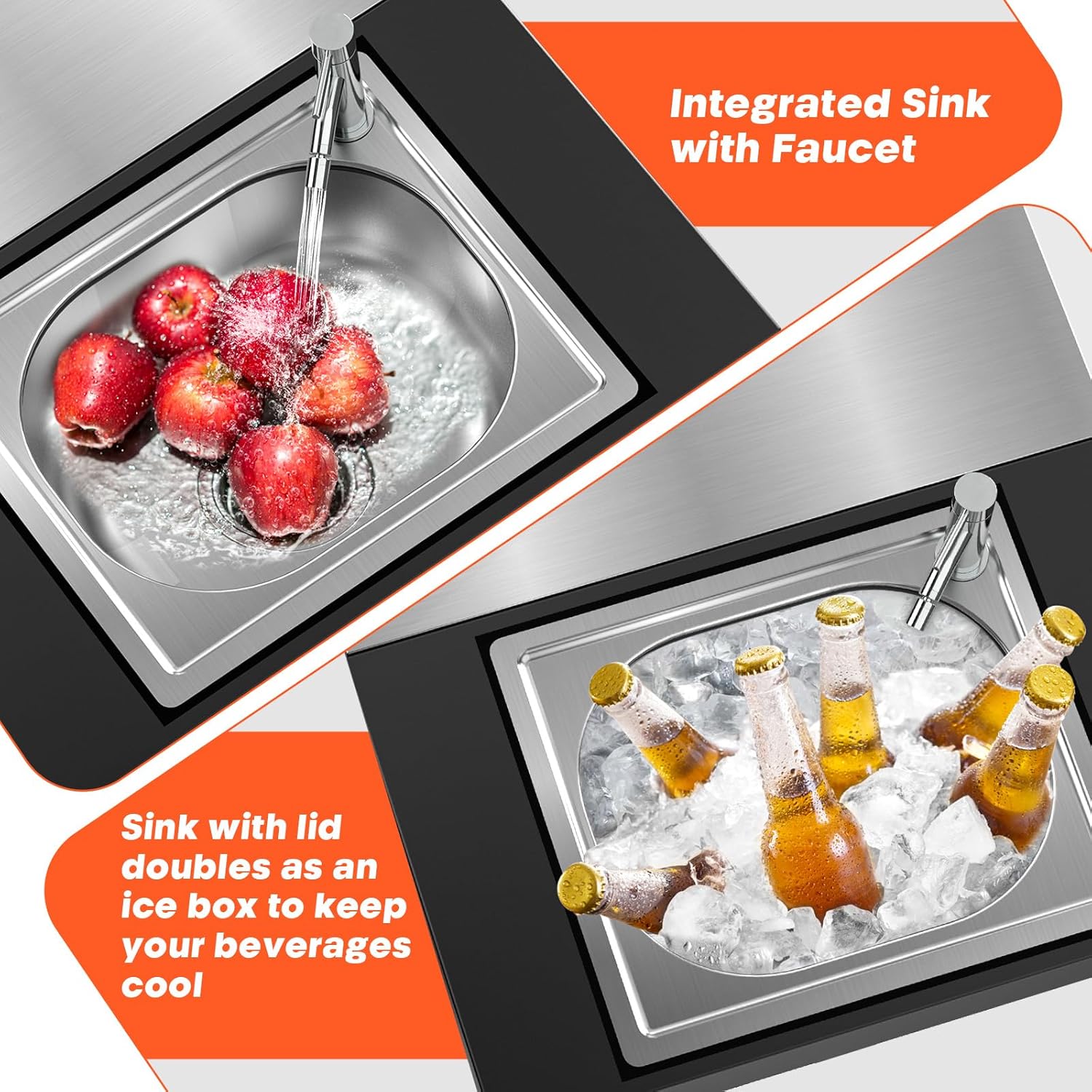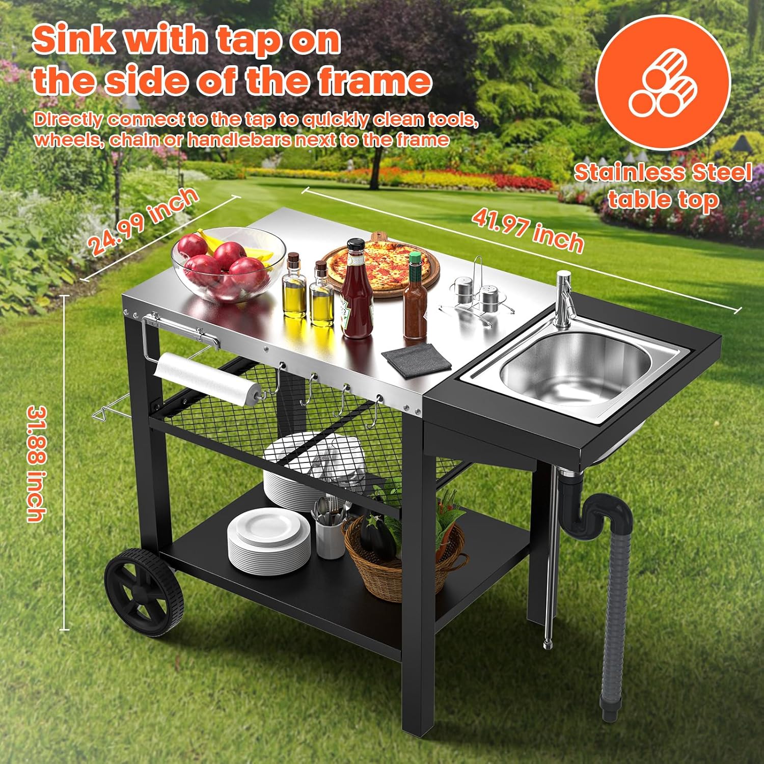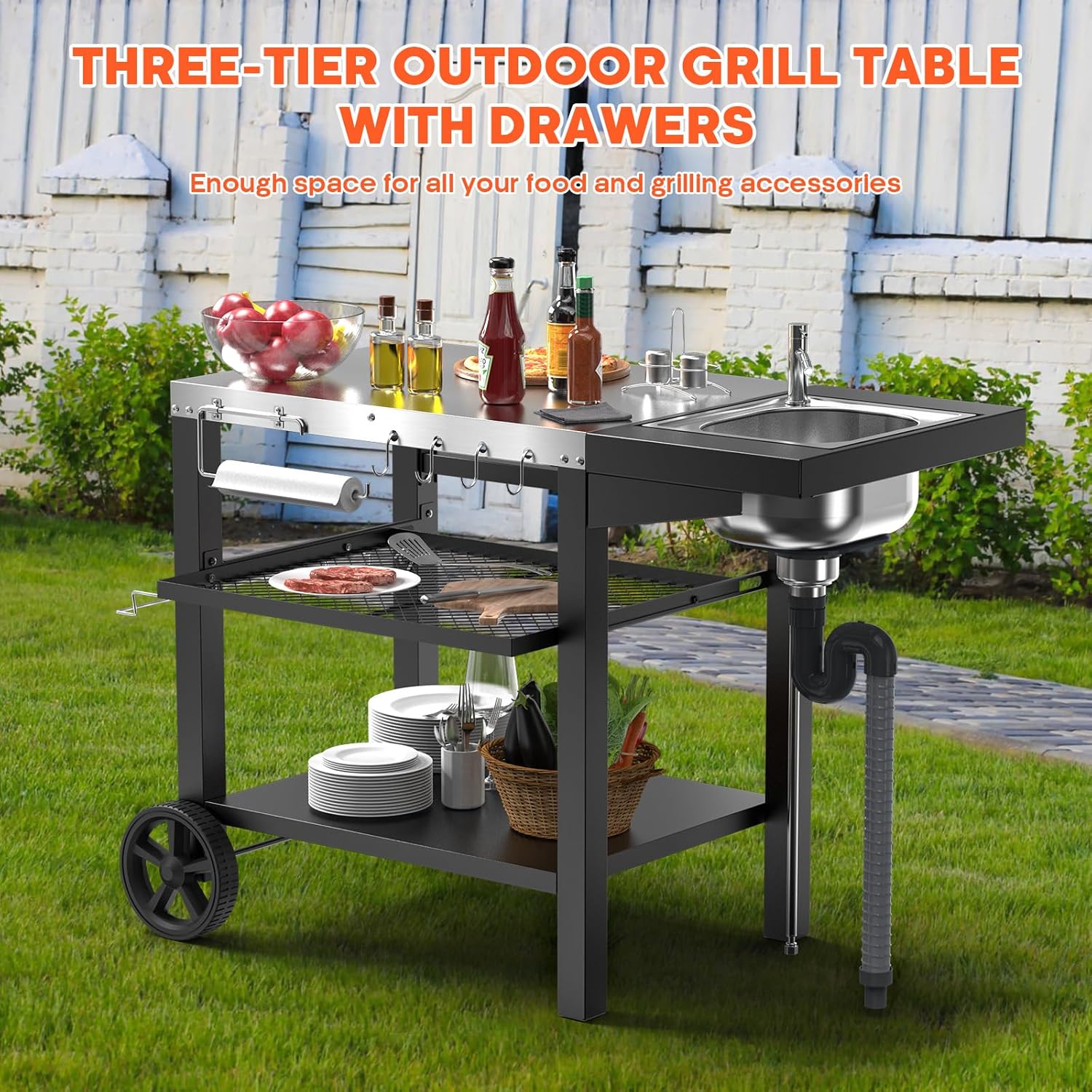 Outdoor Grill Table Cart, Pizza Oven Cart with Sink, Drawer, Wheels, Movable 3 Shelf Food Prep Table for Ninja Woodfire, Blackstone, Ooni, Cuisinart