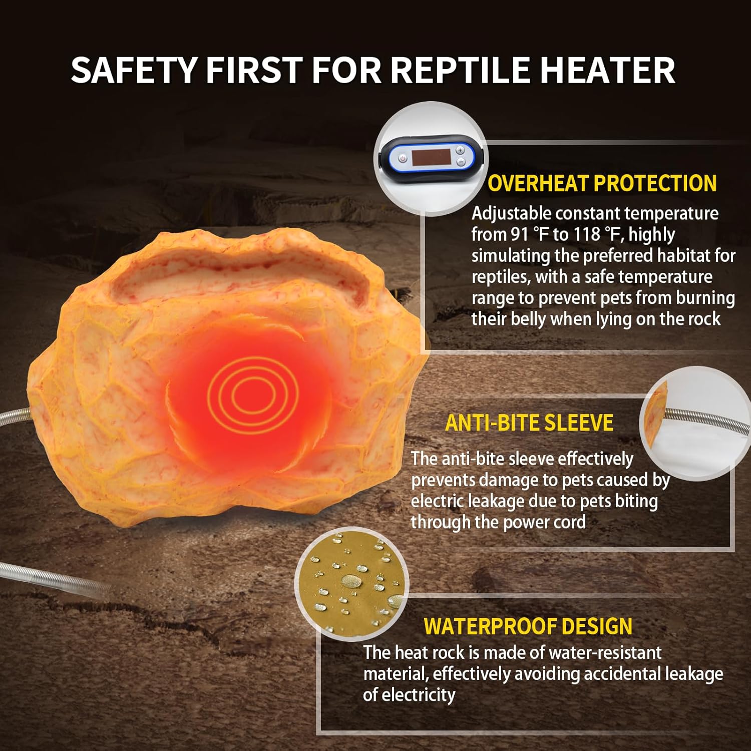 91°F - 118°F TEMPERATURE ADJUSTABLE - The reptile heating rock features digital display temperature adjustment control. You can adjust the temperature to a range of 91°F-118°F, ensuring the heater maintains the constant temperature you desire, preventing your pets from getting scalded due to high temperatures. This heated rock is an ideal heat source for desert and tropical species of reptiles, amphibians, and arachnids.