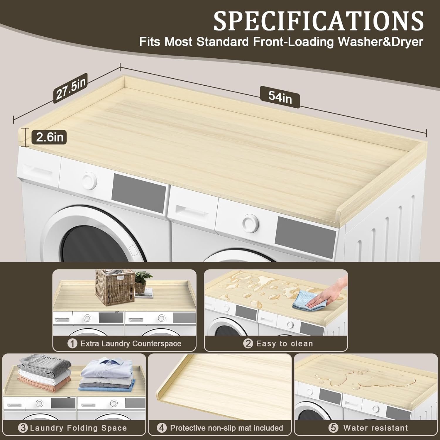 Washer Dryer Countertop 27.5" x 54", Non-Slip Laundry Topper for Washer and Dryer, Edge Rails for Laundry Room Organization and Storage